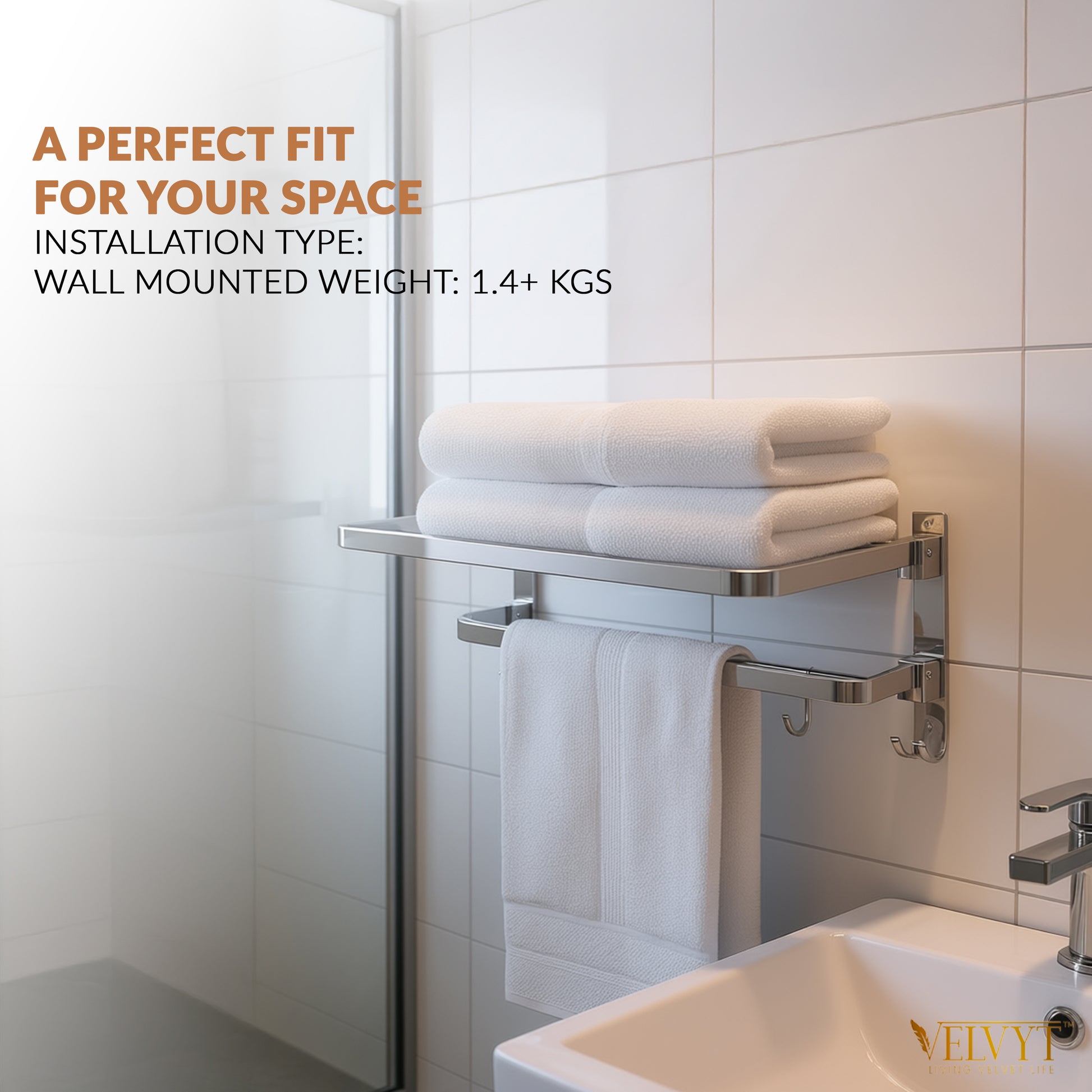24-Inch Wide & Multi-Purpose Storage – Designed for versatility, this towel holder features an upper shelf and a lower bar to hang towels, clothes, or robes, serving as both a bathroom cloth hanger for wall and wall mounted cloth hanger.