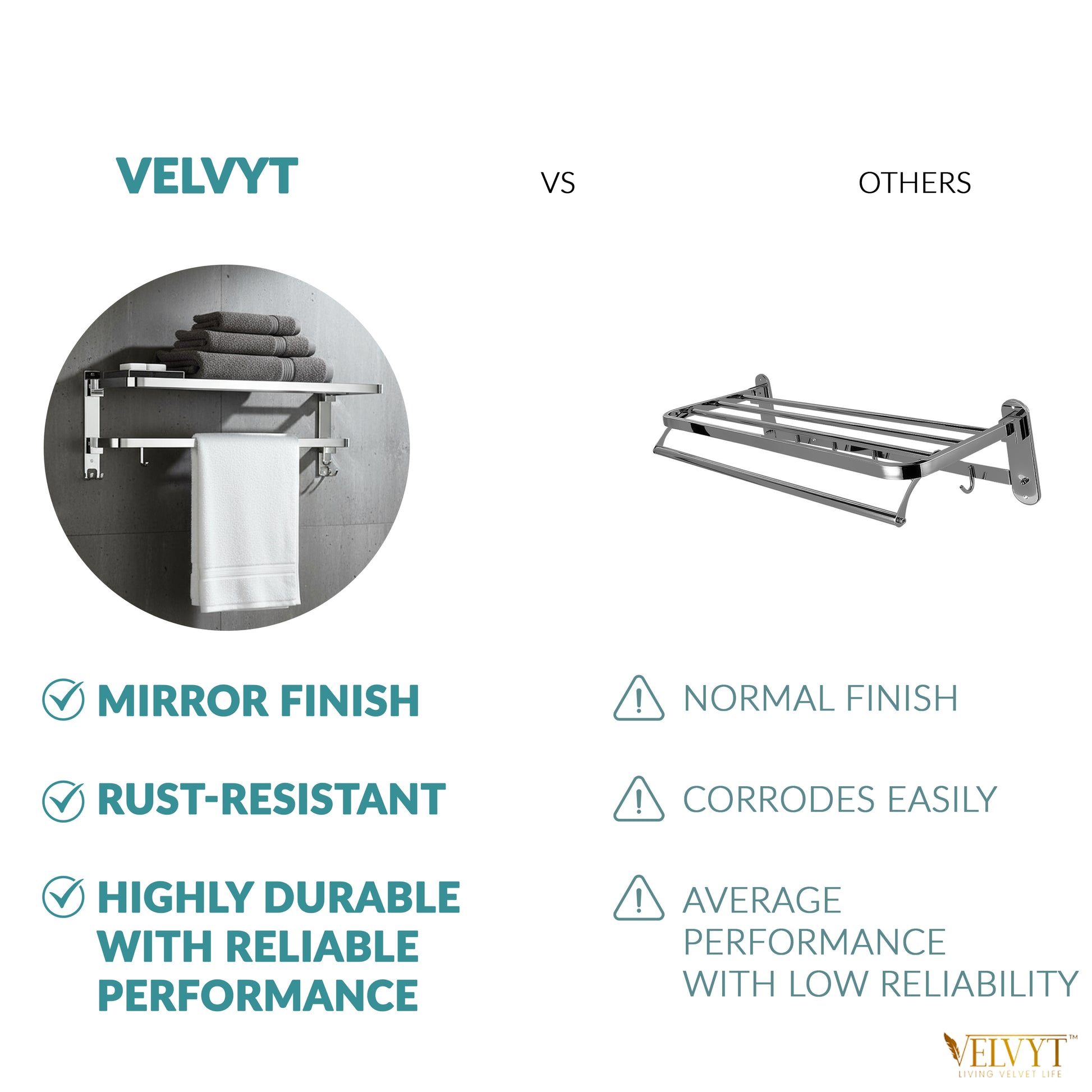 VELVYT Premium Stainless Steel Bathroom Towel Hanger for Wall | Dual Folding Towel Rack in Bathroom & Bathroom Hangers for Clothes| 24 Inch | Space Saving - Chrome Finish